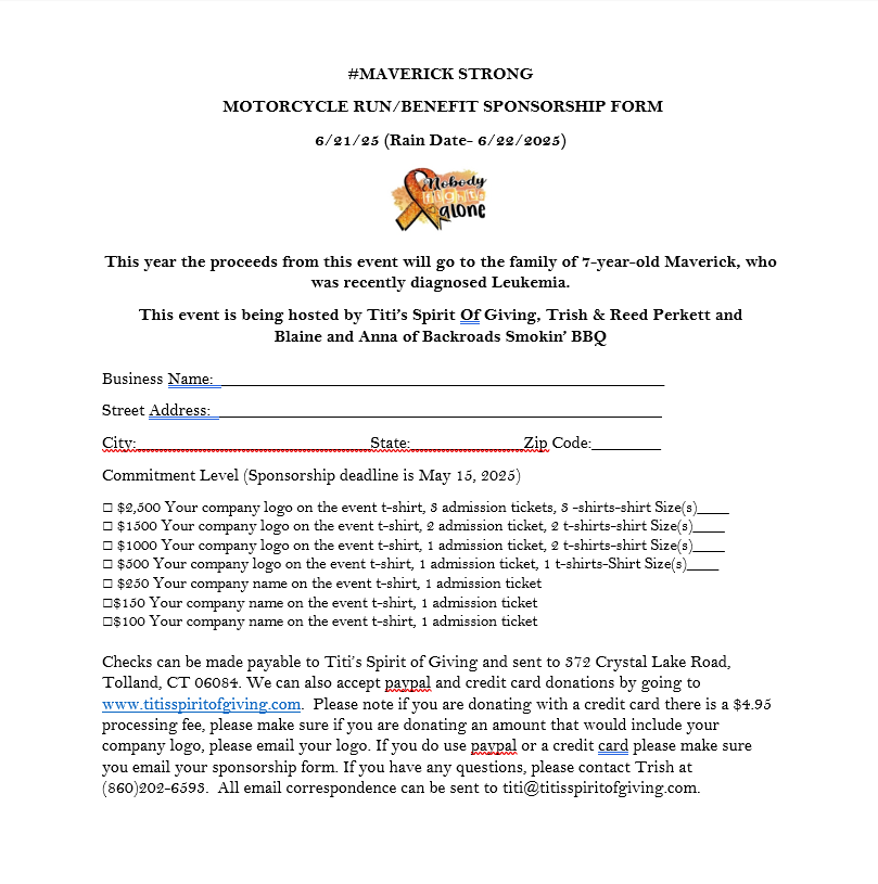 Hi there! My name's Titi, I'm 54 years old and live with my husband and two German Shepards in Tolland. I'm the proud aunt of 5 nephews, 3 nieces, 2 great nieces, and 3 great nephews. My passion is to host events to help those who most need it. I've worked hard with dozens of sponsors to make sure our fundraisers help those in need.
